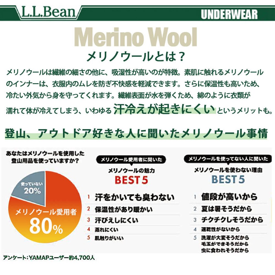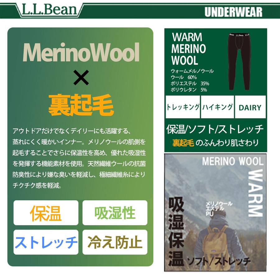 【L.L.Bean/エルエルビーン】 アウトドア 裏起毛タイツ メンズ ウォームメリノウール 吸湿速乾 汗冷え防止 レギンス 24lbm1133