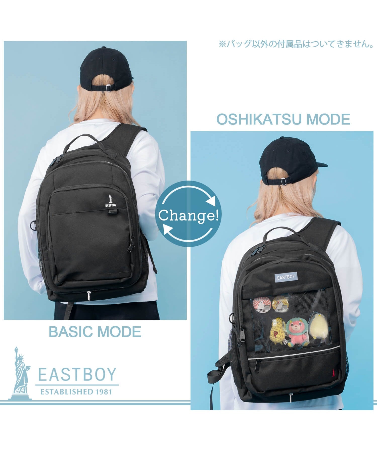 【EASTBOY/イーストボーイ】 ブランド ロゴ 2WAY 推し活 ヲタ活 クリアポケット付き リバーシブル フロントポケット 大容量 バックパック リュックサック 痛バッグ 約30L